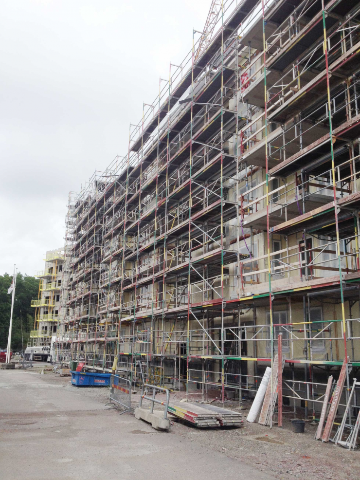 - Gipsningsarbeten på insida yttervägg pågår på de nedre våningarna.